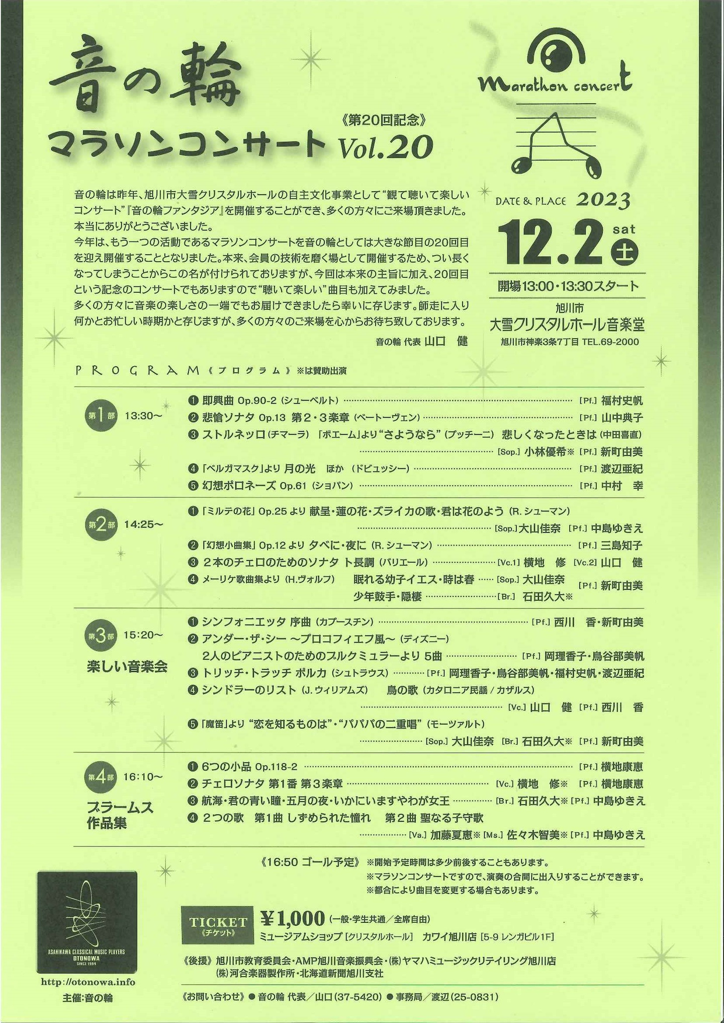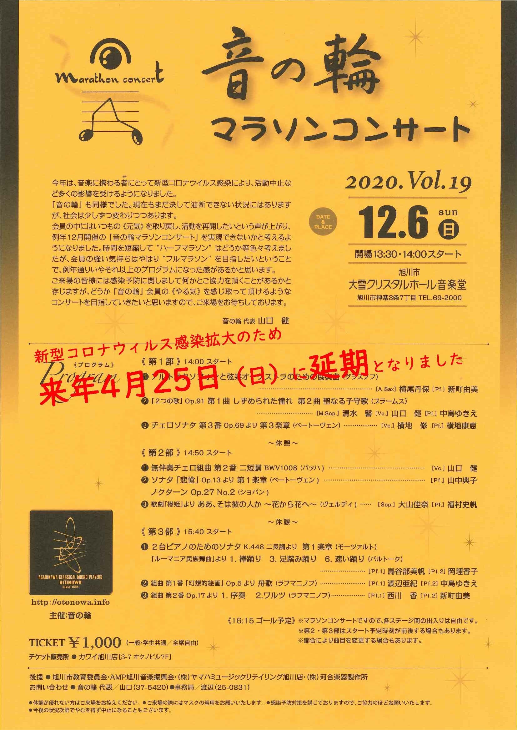 12月6日(日)旭川大雪クリスタルホール音楽堂にて開催を予定しておりました「音の輪マラソンコンサート Vol.19 」は、新型コロナウィルス感染症の影響と出演者・ご来場頂くお客様の安全性を最優先に考慮し検討した結果、コンサートの開催を延期させて頂くことになりました。