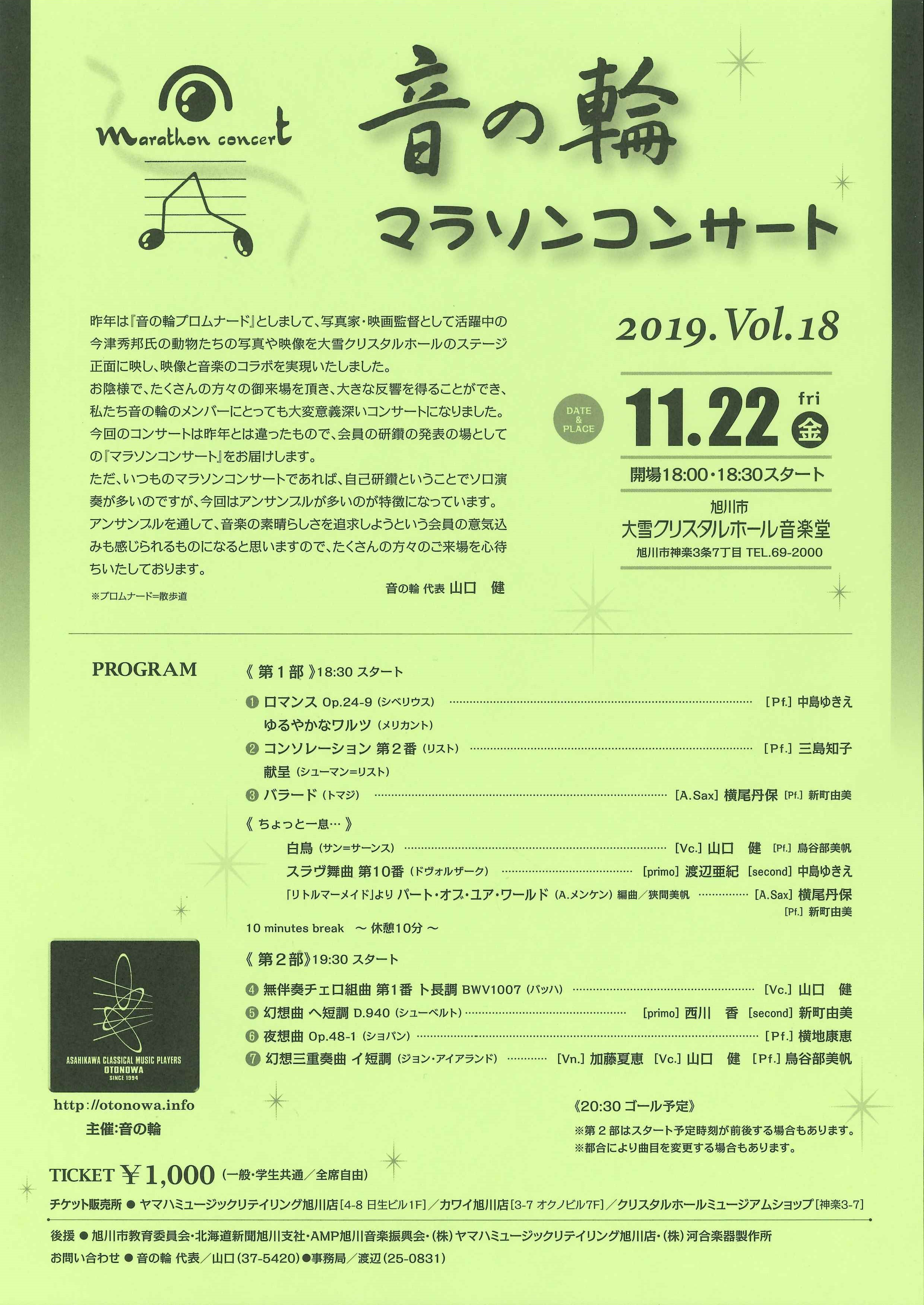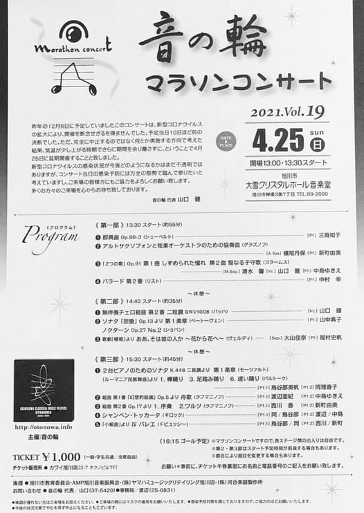 昨年12月6日(日)旭川大雪クリスタルホール音楽堂にて開催を予定しておりました「音の輪マラソンコンサート Vol.19 」の振替公演は4月25日に一部内容を変更して予定通り開催させていただきます。